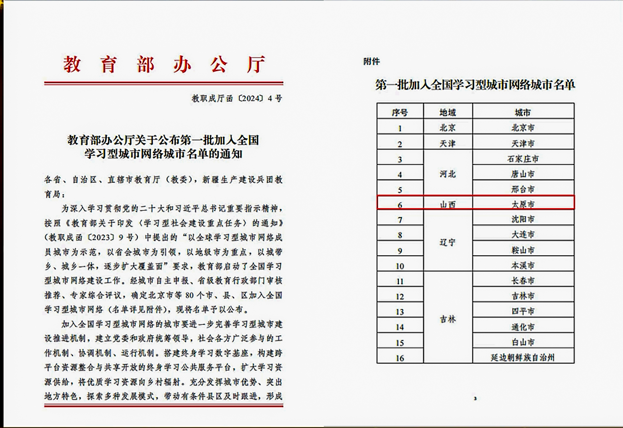 2024年2月,太原市入选首批全国学习型城市网络城市