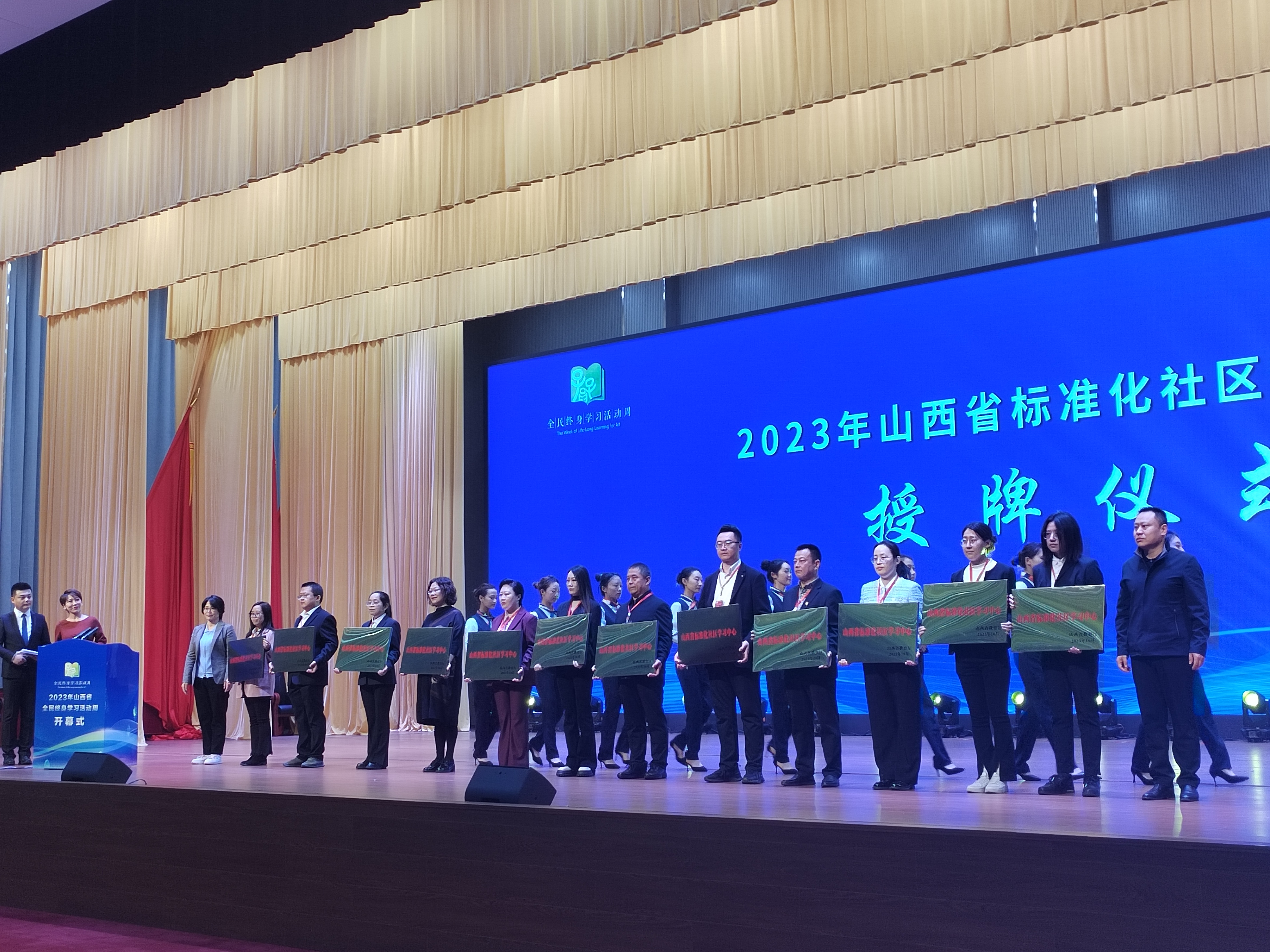 2023年10月,在阳泉举办的全省学习周启动仪式上,为首批入选标准化社区学习中心单位代表颁发奖牌(左五为杏花岭区代表)